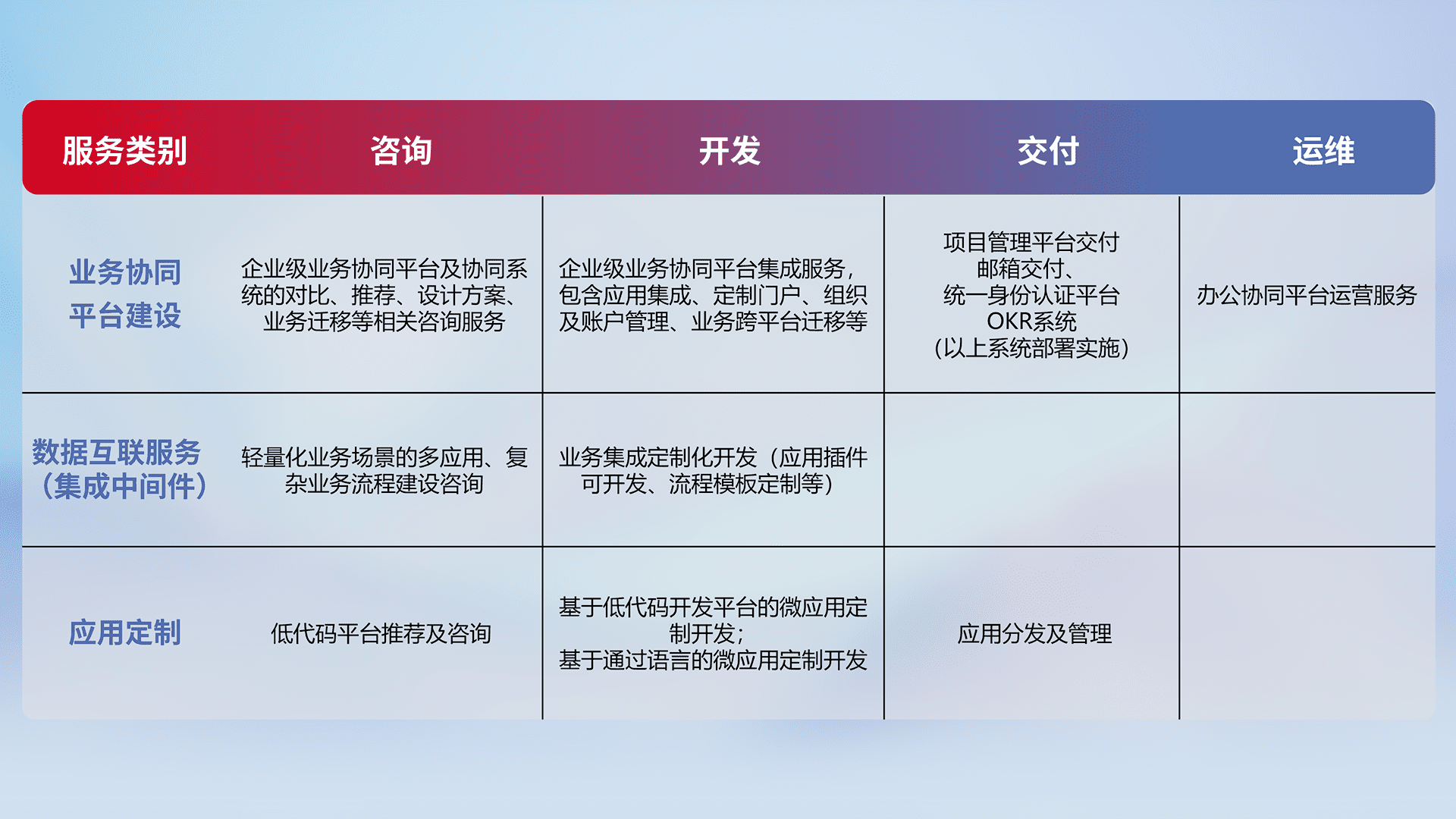 针对钉钉、、企微、、、IDaas等平台级产品提供产品的规划、、、方案、、、交付、、、定制化开发等服务,,实现如统一协同办公、、、智能客户服务、、、、混合会议管理、、智能数据查询、、、、等业务场景,,,,实现数字化转型。。