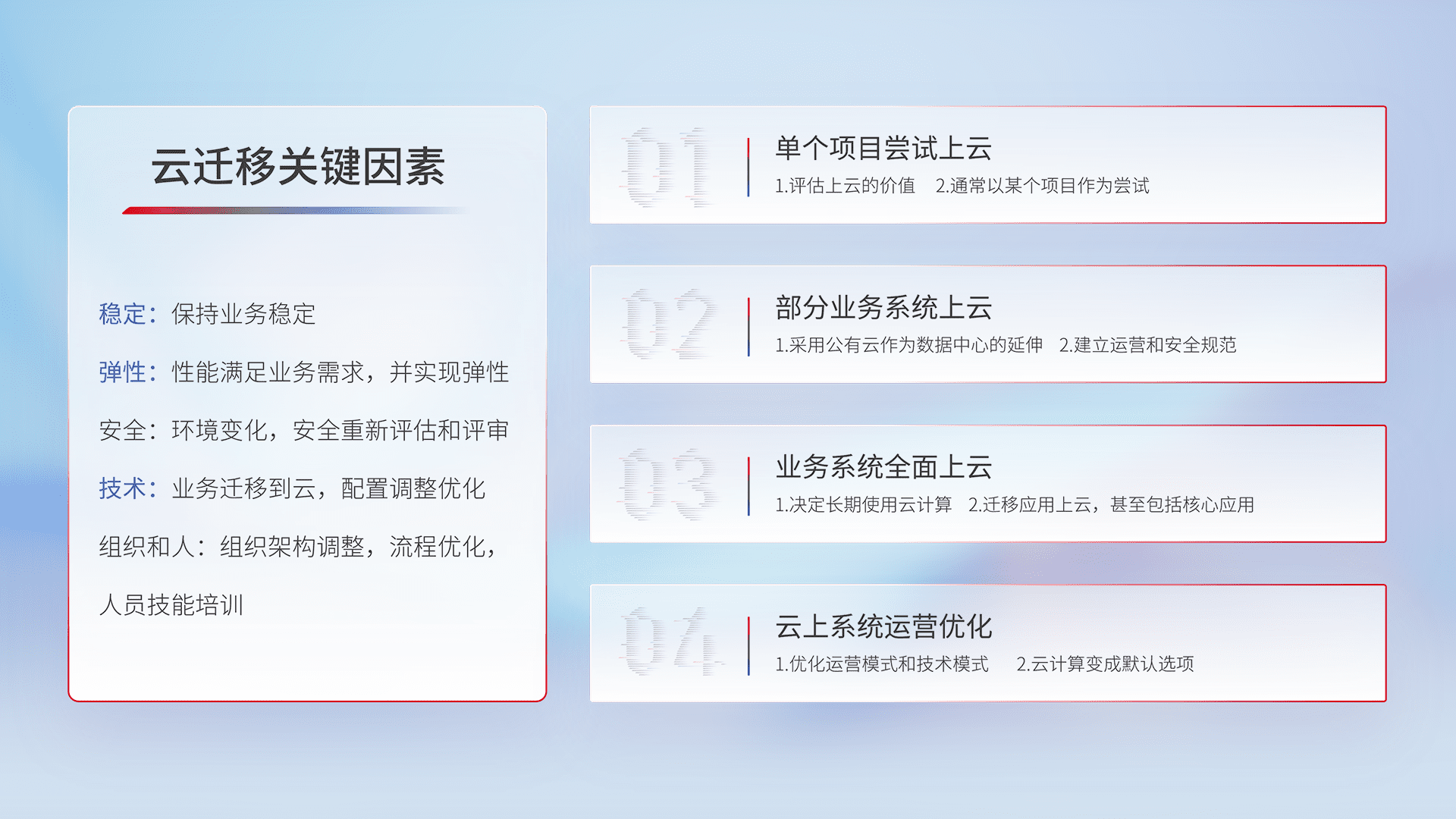 结合实际业务,,,从规划设计、、、、云平台选型、、云原生改造、、、数据迁移、、、、集成交付,,迁移全过程为客户识别最佳上云路径,,,做好风险识别管理,,,,设计网络架构、、、身份权限、、、、安全审计合规、、操作审计、、、日志审计、、、、监控告警策略、、、、多站点容灾设计等,,,,对云上基础设施进行整体规划,,,提升IT治理水平,,,以满足弹性、、、高可用、、、、高性能的需求。。。。
